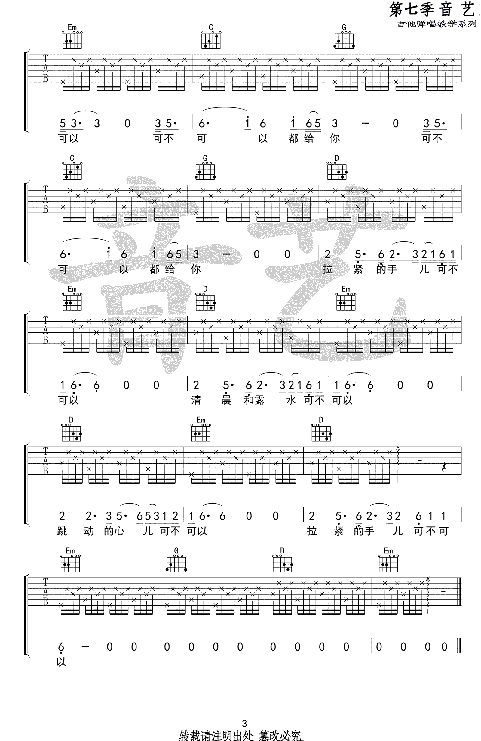《给你吉他谱_茶季杨_《给你》G调原版六线谱_吉他弹唱教学分享,《给你》是彝族民谣音乐人茶季杨作词作曲并演唱的一首民谣歌曲,这个时代从来不缺音乐的狂欢,而民谣音乐直抵心灵深处的纯粹,却显得弥足珍贵。他的作品融合了民族、世界音乐、民谣、以及流行音乐的元素。曲风悠扬,动听。有浓郁的西部风情,质朴柔和的内敛和淡淡的忧愁,把自己独有的简单纯粹流露在音乐里。