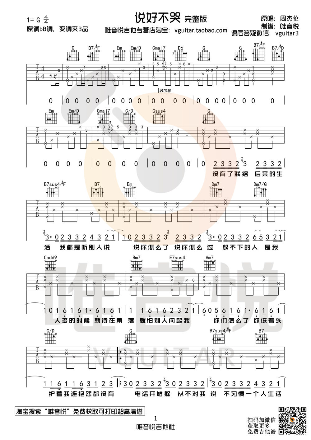 说好不哭吉他谱,它是周杰伦演唱的原版歌曲它的歌词是如此的感人和动人.,由唯音悦制谱,是一首经典简单的吉他谱,适合新手学习和弦指弹的G调编配曲谱,弹唱时可弹唱时变调夹夹第四品,,原调G调本次教学采用G调,是非常好听的弹唱曲谱,下面完整版高清六线谱由吉它谱大全为大家更新分享。有喜欢吉它的朋友欢迎关注!