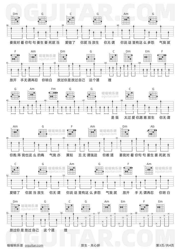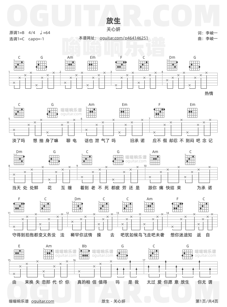 放生吉他谱,关心妍歌曲,C调高清图,4张六线原版简谱