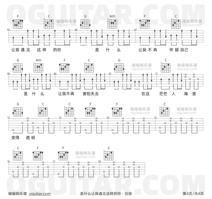 是什么让我遇见这样的你吉他谱,白安歌曲,C调指弹简谱,4张教学六线谱