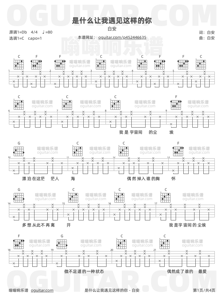 是什么让我遇见这样的你吉他谱简单版,它是白安演唱的原版歌曲,指弹六线谱子由嗡嗡响制谱,是一首经典歌曲编配的C调吉他简谱,演唱时可夹第1品(Capo=1),演奏弹唱时间为4分17秒,原调为Db本谱采用C调,是非常好听的新手弹唱谱,下面4张完整版高清曲谱图片由吉他部落jita2012.com为大家更新分享,有喜欢吉它的朋友欢迎收藏!