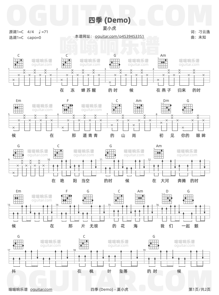 四季吉他谱,夏小虎歌曲,C调指弹简谱,2张教学六线谱【Demo版】