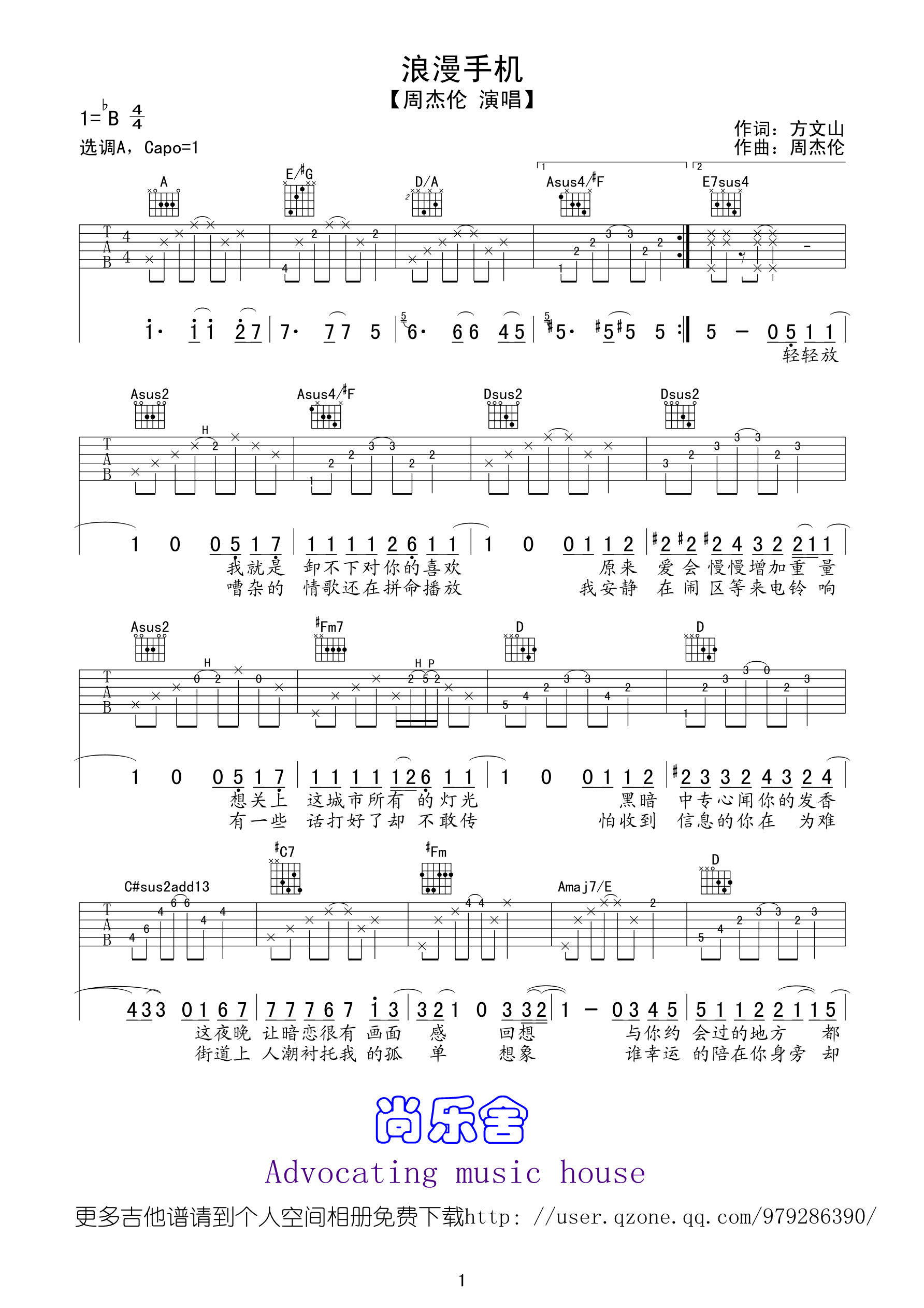 以上就是4/4节拍 A调版的浪漫手机弹唱简谱,如果正是您所寻找的六线高清图片谱,希望能收藏本站,这里会完全免费且源源不断更新各种周杰伦简单入门曲谱
