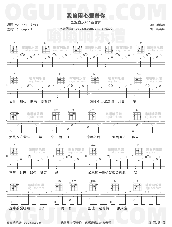 我曾用心爱着你吉他谱,zan昝老师歌曲,C调指弹简谱,4张教学六线谱