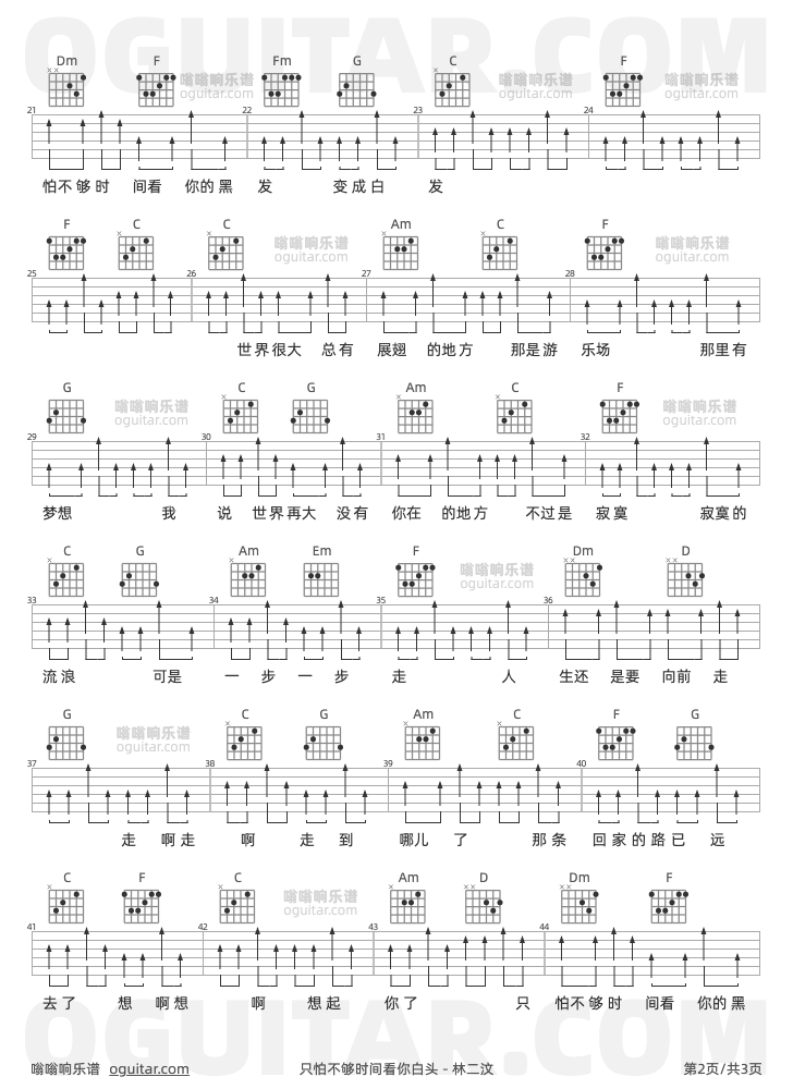 只怕不够时间看你白头吉他谱,林二汶歌曲,C调指弹简谱,3张教学六线谱