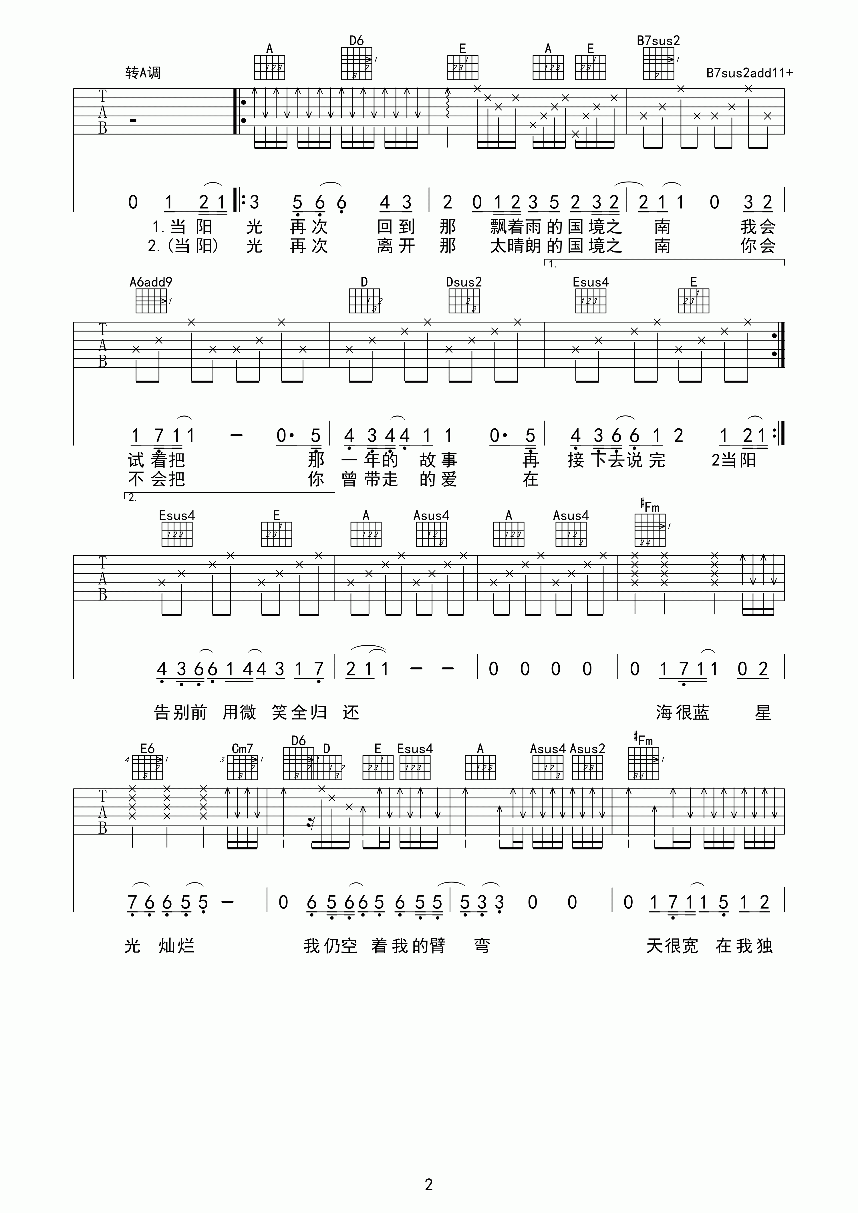 国境之南吉他谱采用C调吉他指法弹奏,也可自由发挥。2张高清图片六线谱。国境之南这首歌在站内还有其他曲调版本