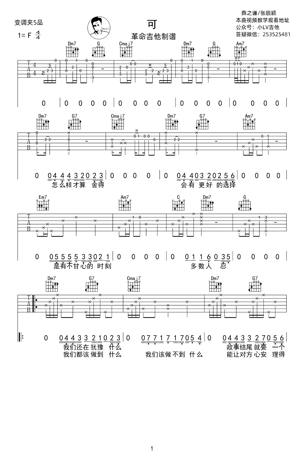 可这首歌,薛之谦/张靓颖演唱的一首男女合唱情歌,感情里分合难舍,总是不肯轻易放过。《可》吉他弹唱谱,原调F,编配,Capo夹五品,完整版共三张高清图片六线谱。
