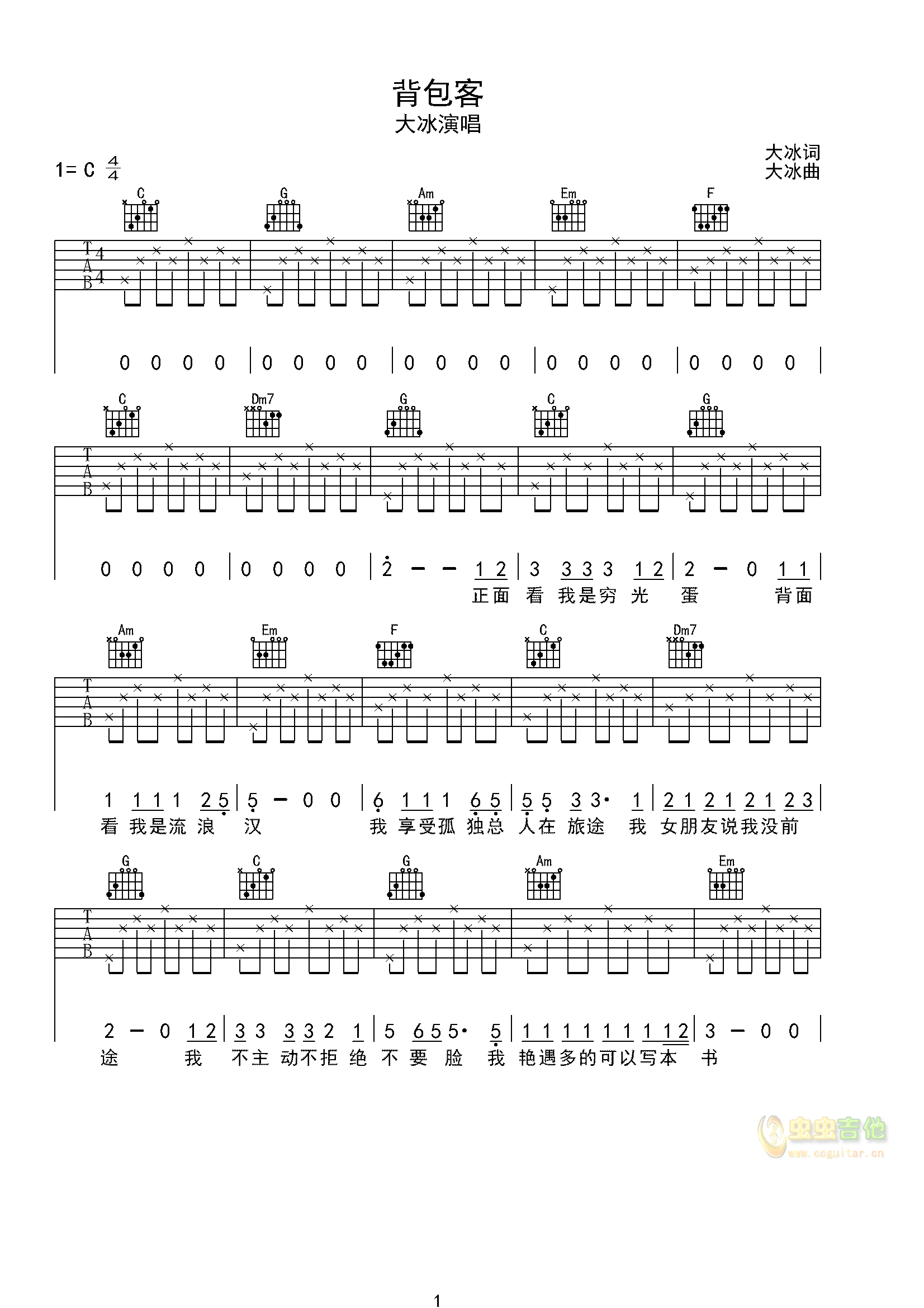 背包客吉他谱是大冰演唱的一首好听的歌曲,采用C调原版吉他弹奏,。演唱时不夹变调夹即可保持原调,也可根据个人嗓音情况选择,,也可自由发挥。。