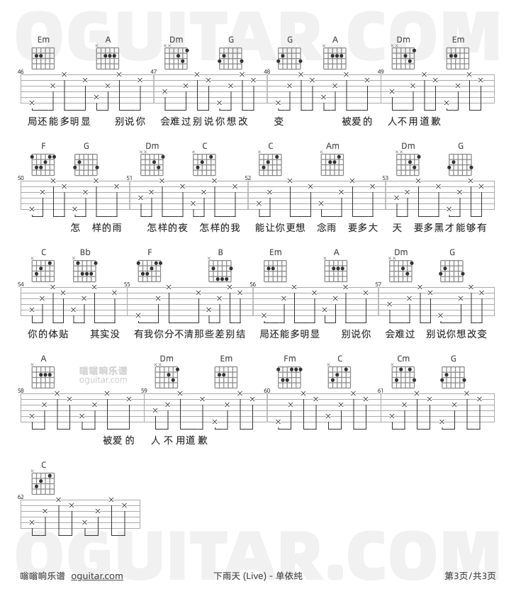 下雨天吉他谱,单依纯歌曲,C调指弹简谱,3张教学六线谱【Live版】