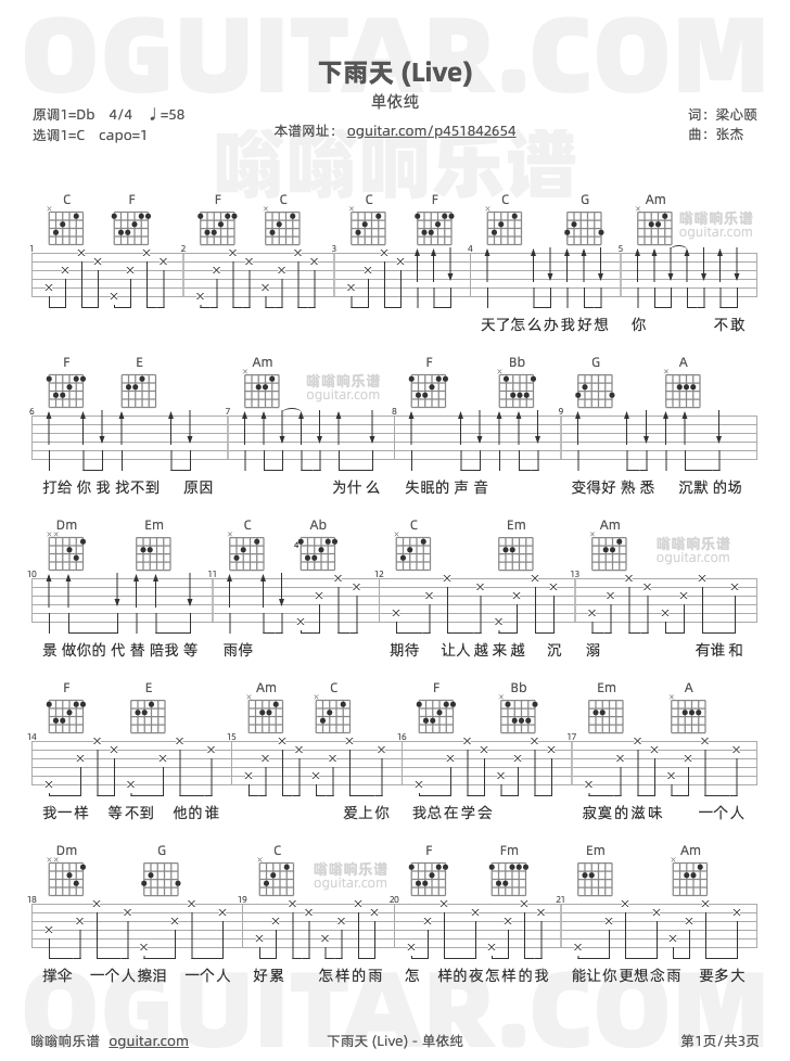 下雨天吉他谱简单版,它是单依纯演唱的原版歌曲,指弹六线谱子由嗡嗡响制谱,是一首经典歌曲编配的C调吉他简谱,演唱时可夹第1品(Capo=1),演奏弹唱时间为4分30秒,原调为Db本谱采用C调,是非常好听的新手弹唱谱,下面3张完整版高清曲谱图片由吉他部落jita2012.com为大家更新分享,有喜欢吉它的朋友欢迎收藏!