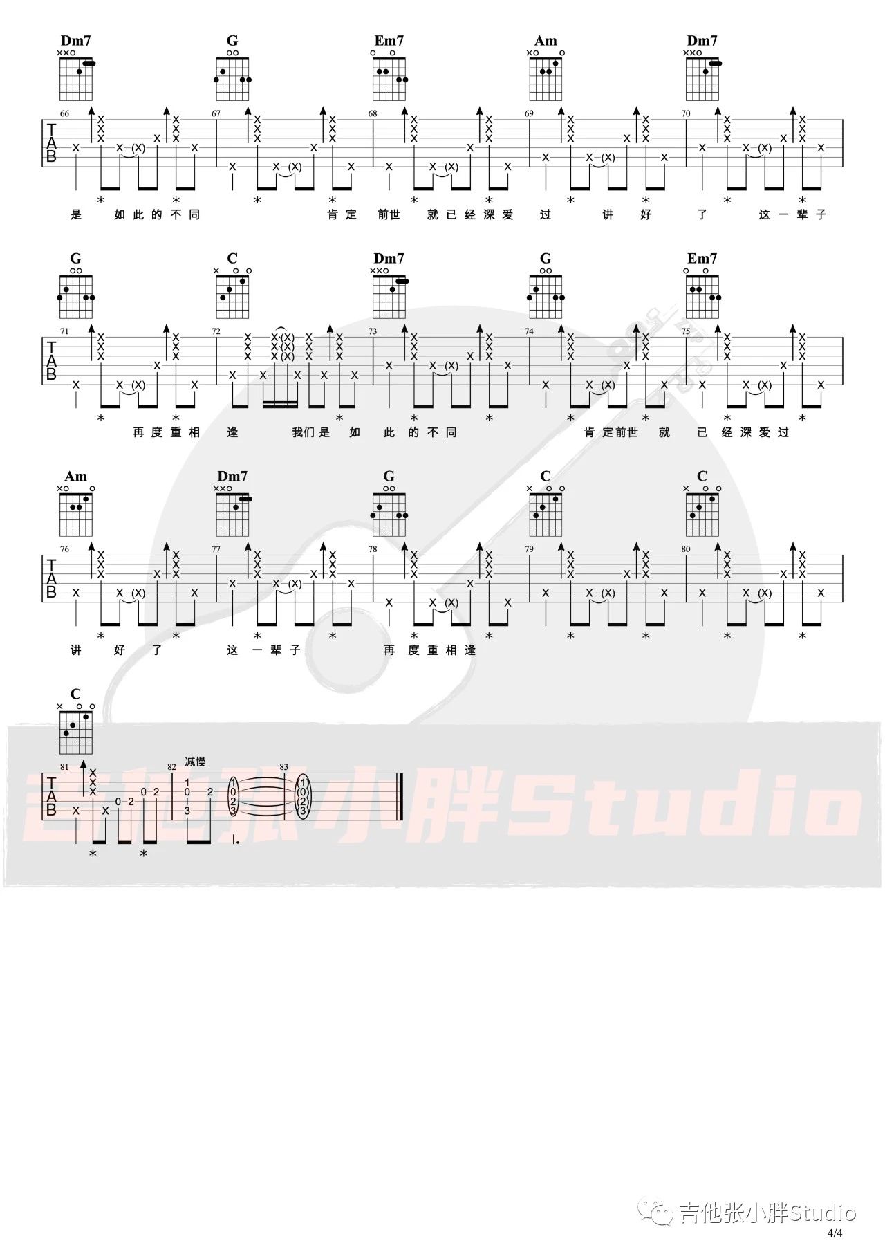 再度重相逢吉他谱,伍佰演唱的一首老歌,来自吉他张小胖编配六线谱,C调标准版吉他六线谱,共四张谱例。这首歌的演奏部分不难,基本都是基础的C调和弦,大家都很熟悉。此外作者在和弦的基础上加了一些三品内的旋律音,拍子也都挺规整。