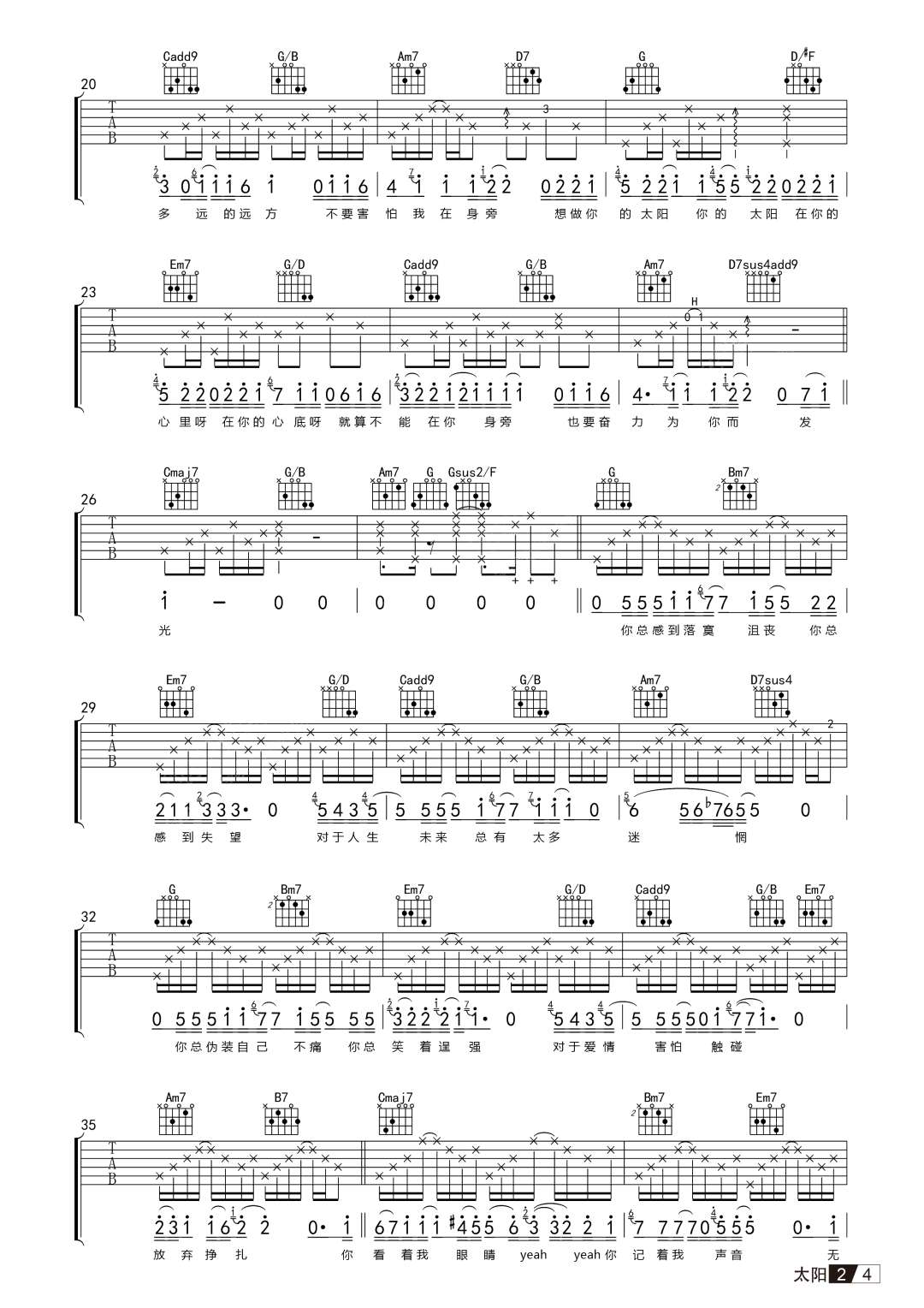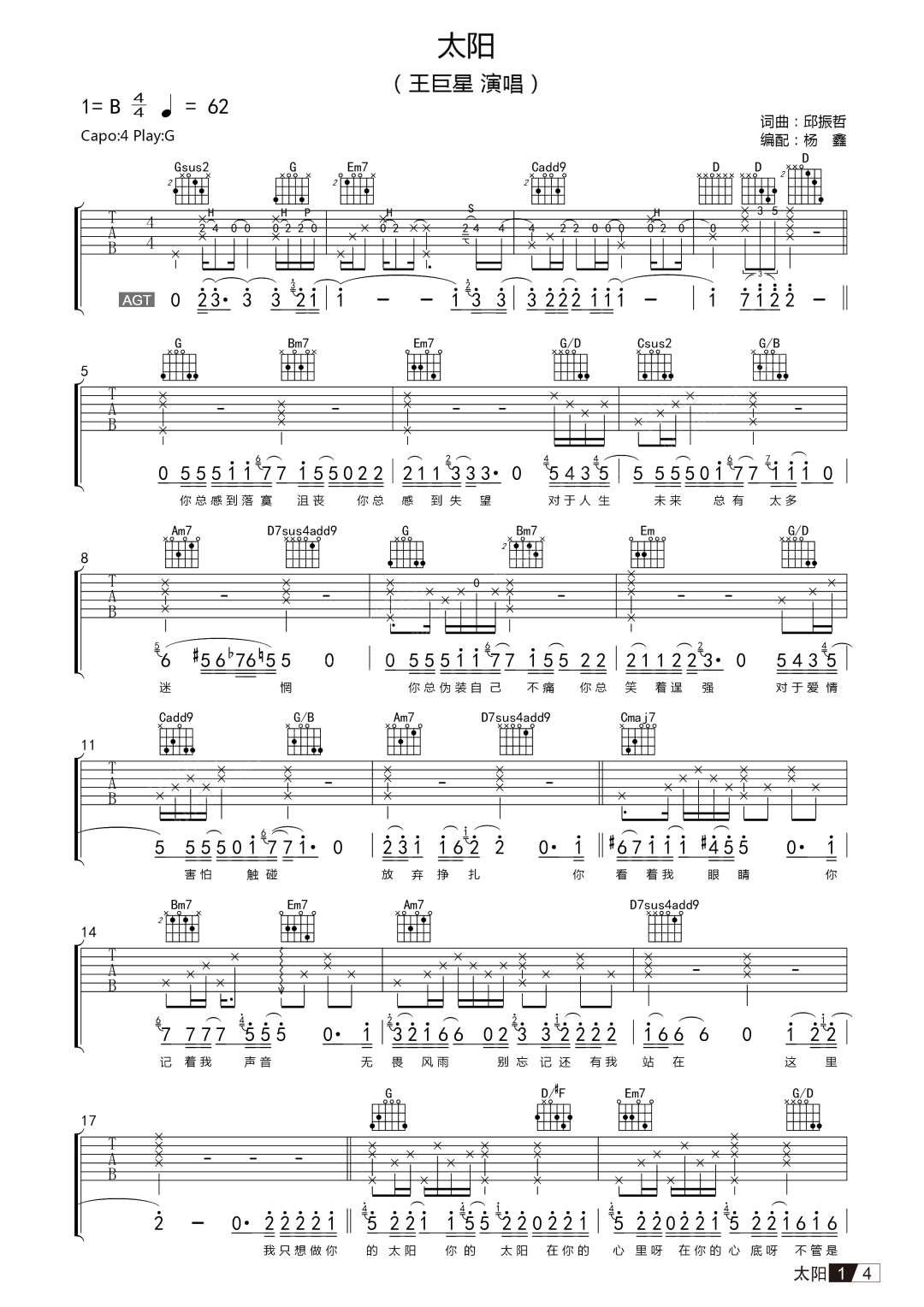 太阳吉他谱,它是王巨星演唱的原版歌曲,这首歌是如此的抒情和感人.经典歌曲编配的G调,4/4拍子 不夹变调夹 演奏速度95bmp,杨鑫制谱 是非常好听弹奏难度:为中等的入门弹唱曲谱,下面为大家分享高清有2张图片谱,有喜欢吉它的朋友欢迎关注!