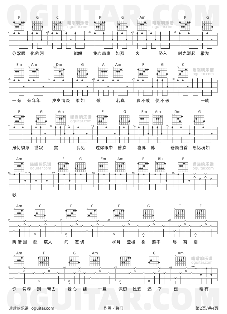 烈雪吉他谱,将门歌曲,C调指弹简谱,4张教学六线谱