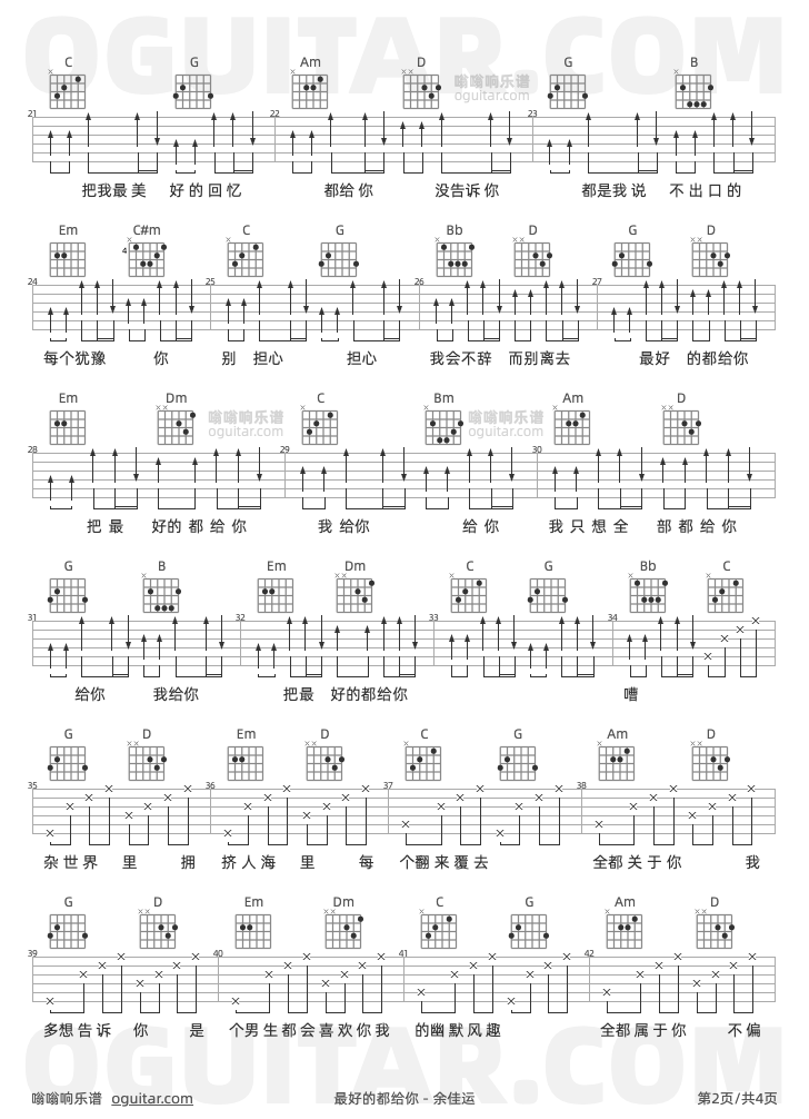 最好的都给你吉他谱,余佳运歌曲,G调指弹简谱,4张教学六线谱
