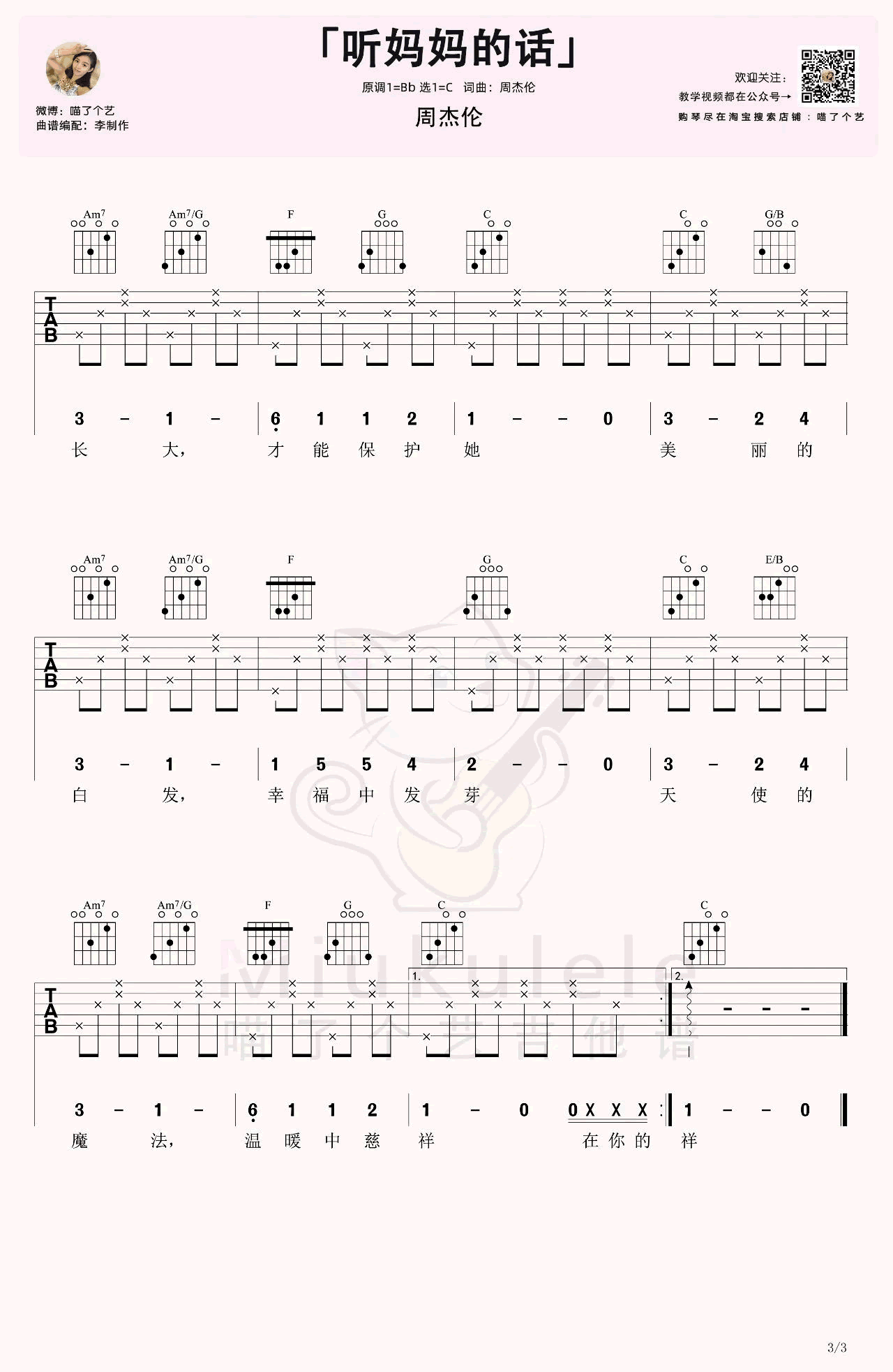 听妈妈的话吉他谱,它是周杰伦演唱的原版歌曲,它的歌词很优美,很容易被记住.经典歌曲编配的C调,4/4拍子 不夹变调夹 演奏速度95bmp,喵了个艺制谱 是非常好听弹奏难度:为中等的入门弹唱曲谱,下面为大家分享高清有2张图片谱,有喜欢吉它的朋友欢迎关注!