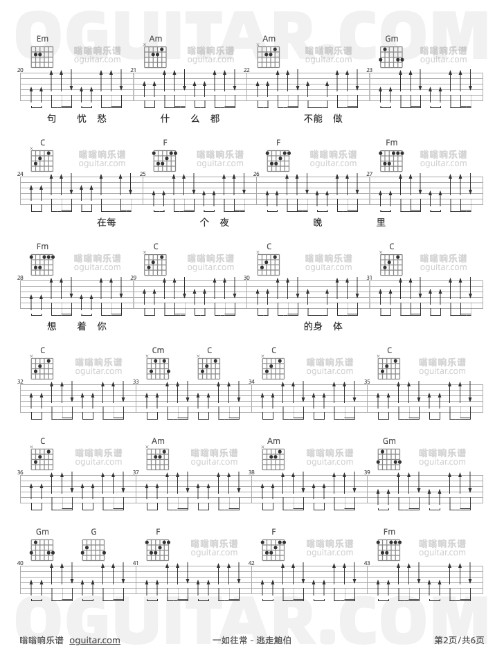 一如往常吉他谱,逃走鮑伯歌曲,C调指弹简谱,6张教学六线谱