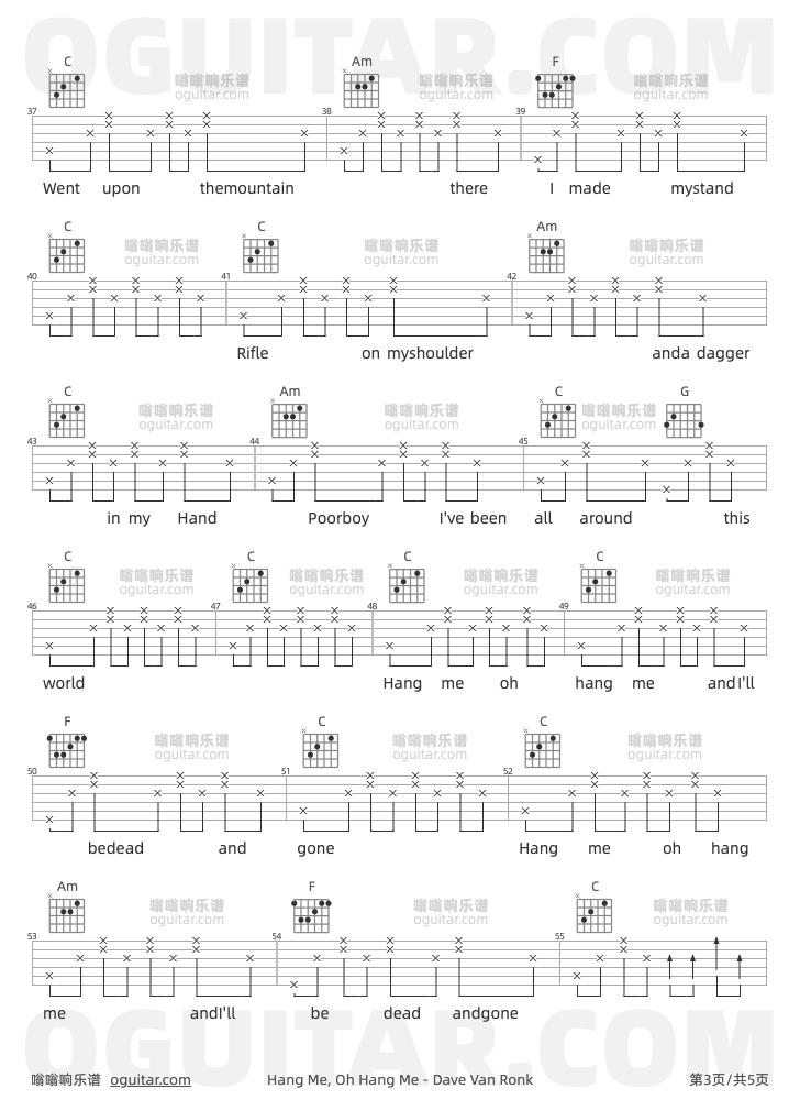 HangMe,OhHangMe吉他谱,Dave Van Ronk歌曲,C调指弹简谱,5张教学六线谱