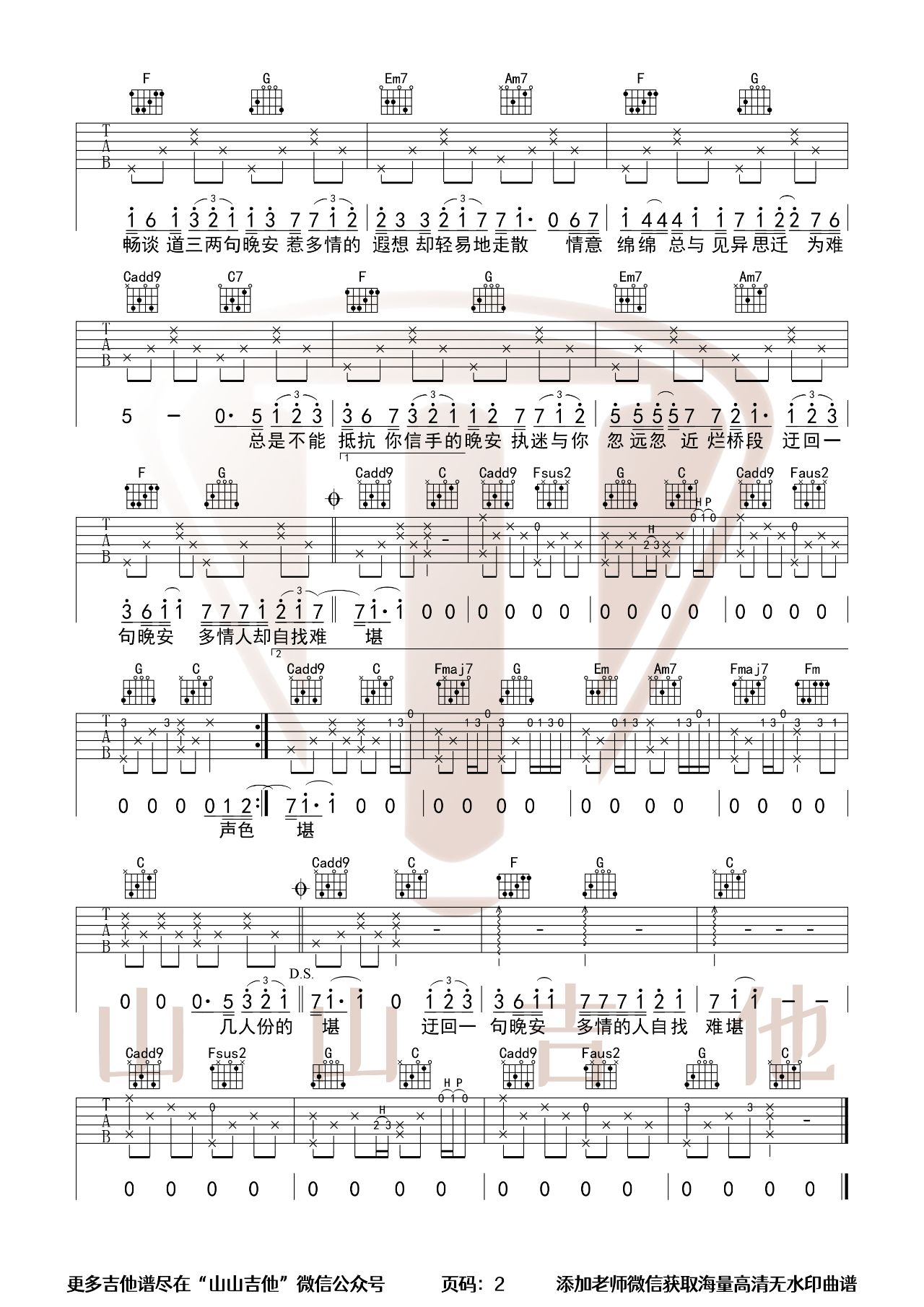 以上就是C调版的晚安吉他谱_吉他弹唱演示_C调高清版吉他谱 ,如果正是您所寻找的六线高清图片谱,希望能收藏本站,这里会源源不断更新各种颜人中的曲谱。其中简单版谱子和教学特别适合新手和入门学习。如果你想弹唱歌曲,可以选择带有歌词和伴奏的吉他谱来弹奏前奏。