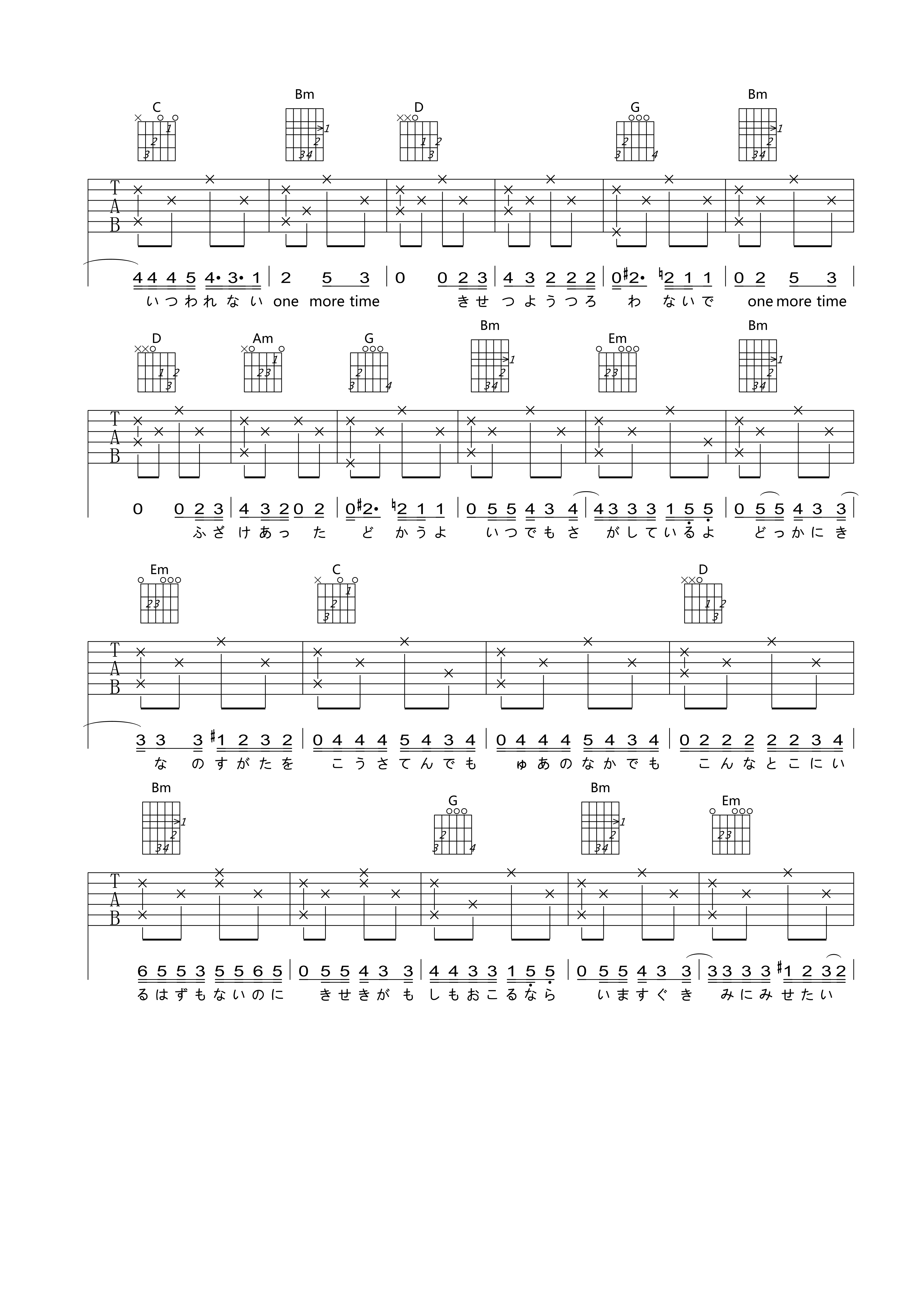 《One More Time One More Chance》吉他谱,采用g调吉他弹奏,这首无论男女老少都很喜欢,旋律朗朗上口,我很喜欢,而这个声音给我一种不一样的感觉,特别是旋律,也是不错的一次创作,很喜欢,这首歌很别处心裁,很喜欢因为就像一些曲子一样很容易记住。