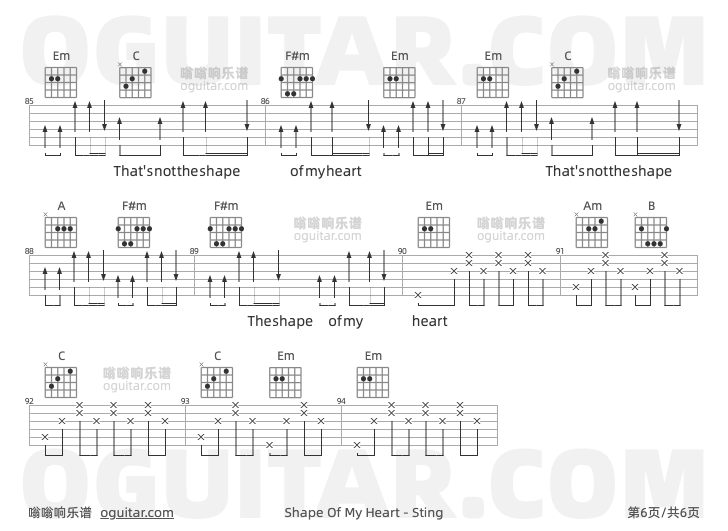 ShapeOfMyHeart吉他谱,Sting歌曲,G调指弹简谱,6张教学六线谱