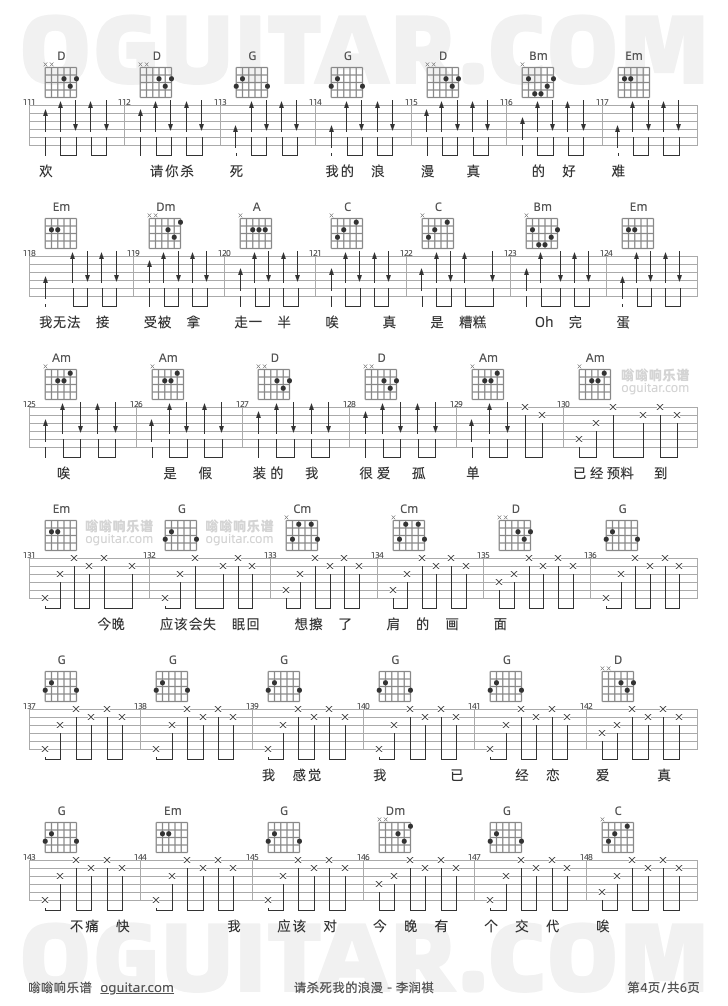 请杀死我的浪漫吉他谱,李润祺歌曲,G调指弹简谱,6张教学六线谱