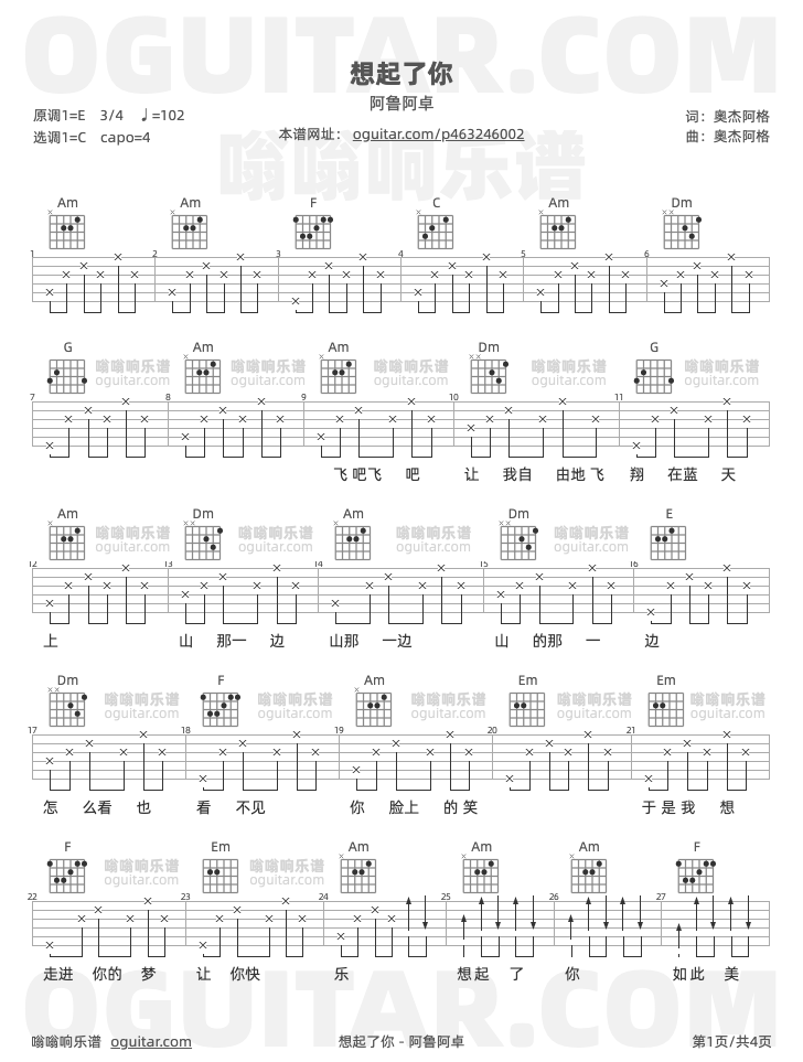 想起了你吉他谱简单版,它是阿鲁阿卓演唱的原版歌曲,指弹六线谱子由嗡嗡响制谱,是一首经典歌曲编配的C调吉他简谱,演唱时可夹第4品(Capo=4),演奏弹唱时间为3分8秒,原调为E本谱采用C调,是非常好听的新手弹唱谱,下面4张完整版高清曲谱图片由吉他部落jita2012.com为大家更新分享,有喜欢吉它的朋友欢迎收藏!