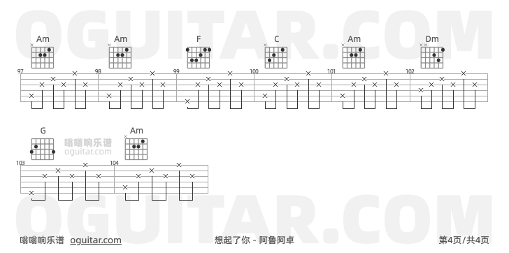想起了你吉他谱,阿鲁阿卓歌曲,C调指弹简谱,4张教学六线谱