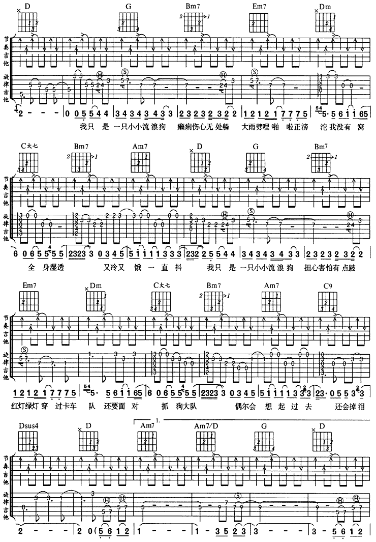 《流浪狗》吉他谱,由游鸿明演唱的,流行弹唱,流浪狗六线谱,C调制法,一共3张高清弹唱图片谱,采用'4/4拍子,拍速为60-80,单吉他,弹奏难度为:中级,吉他部落 jita2012.com整理上传。流浪狗 吉他简谱流浪狗 歌词 今夜又在梦中想起 你的笑容甜美如昔 一句宝贝多么贴心 饼乾罐头一口一口 亲亲抱抱头靠著头 我只需要坐下握手再换手 马路上的公车响起 扫地ㄚ伯正在努力 惊搁