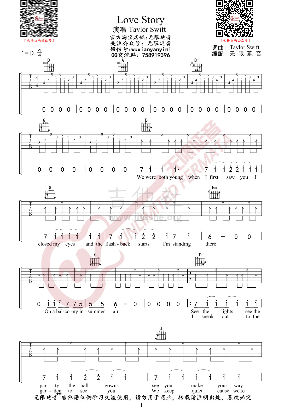 lovestory 吉他谱,它是Taylo演唱的原版歌曲,它的歌词是如此的深刻和真实.经典歌曲编配的D调,4/4拍子 不夹变调夹 演奏速度120bmp,是非常好听弹奏难度:为中等的入门弹唱曲谱,下面为大家分享高清有5张图片谱,有喜欢吉它的朋友欢迎关注!