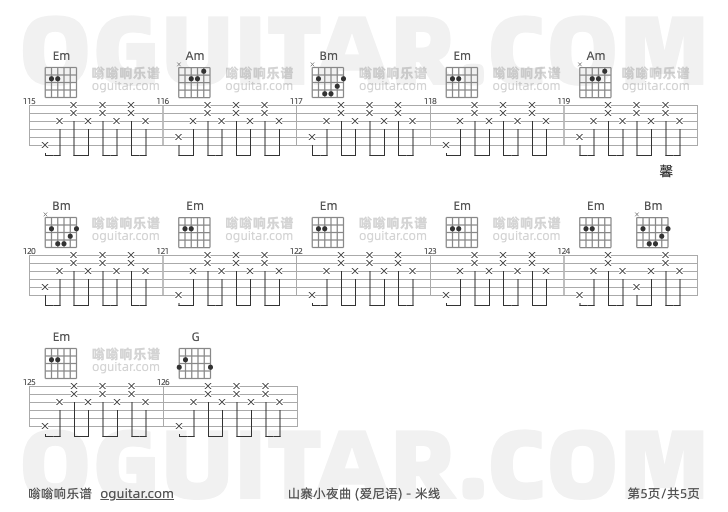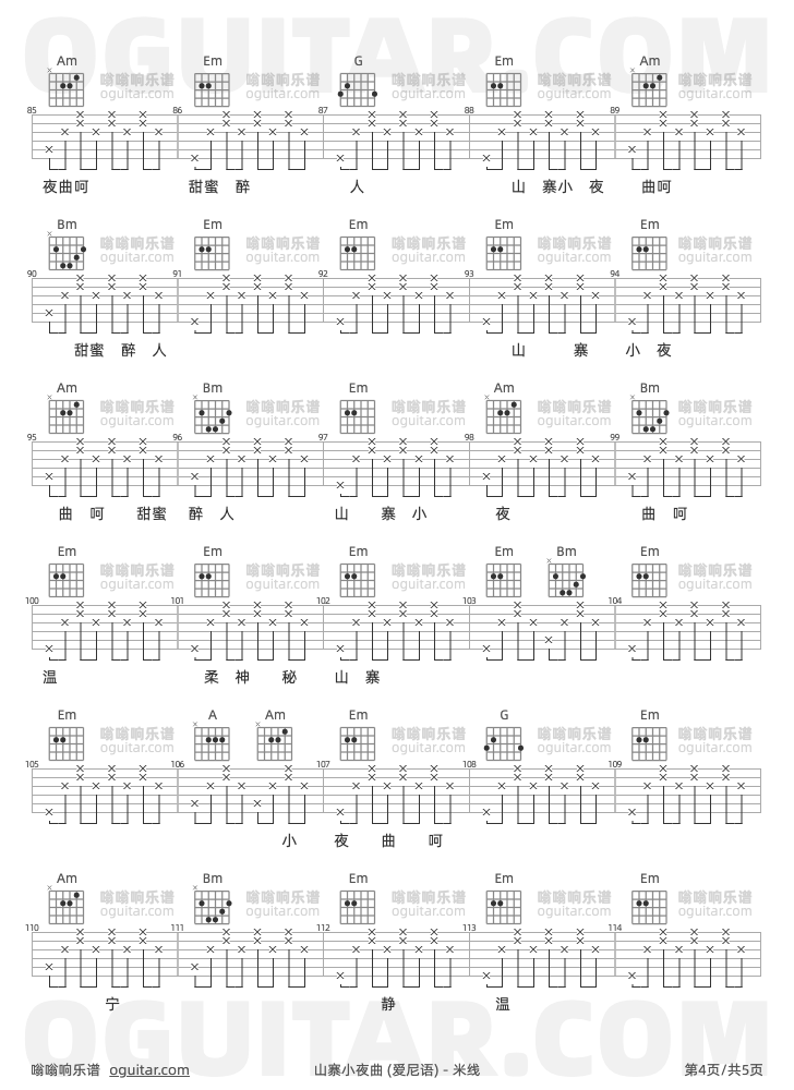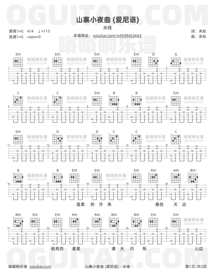 山寨小夜曲吉他谱,米线歌曲,G调指弹简谱,5张教学六线谱【爱尼语版】