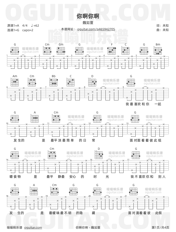 你啊你啊吉他谱简单版,它是魏如萱演唱的原版歌曲,指弹六线谱子由嗡嗡响制谱,是一首经典歌曲编配的G调吉他简谱,演唱时可夹第2品(Capo=2),演奏弹唱时间为5分21秒,原调为A本谱采用G调,是非常好听的新手弹唱谱,下面4张完整版高清曲谱图片由吉他部落jita2012.com为大家更新分享,有喜欢吉它的朋友欢迎收藏!
