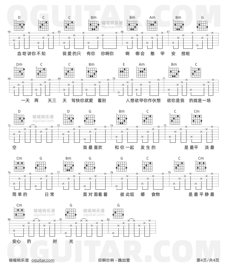 你啊你啊吉他谱,魏如萱歌曲,G调指弹简谱,4张教学六线谱