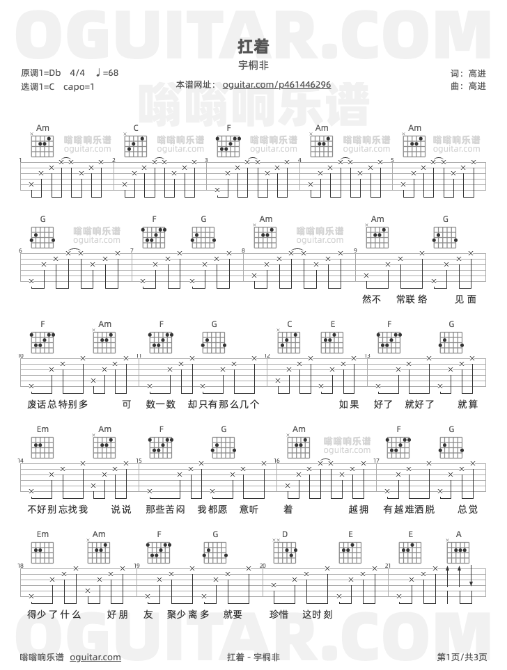 扛着吉他谱简单版,它是宇桐非演唱的原版歌曲,指弹六线谱子由嗡嗡响制谱,是一首经典歌曲编配的C调吉他简谱,演唱时可夹第1品(Capo=1),演奏弹唱时间为4分25秒,原调为Db本谱采用C调,是非常好听的新手弹唱谱,下面3张完整版高清曲谱图片由吉他部落jita2012.com为大家更新分享,有喜欢吉它的朋友欢迎收藏!