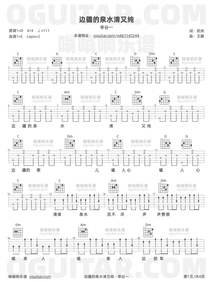 边疆的泉水清又纯吉他谱简单版,它是李谷一演唱的原版歌曲,指弹六线谱子由嗡嗡响制谱,是一首经典歌曲编配的C调吉他简谱,演唱时可夹第2品(Capo=2),演奏弹唱时间为2分55秒,原调为D本谱采用C调,是非常好听的新手弹唱谱,下面4张完整版高清曲谱图片由吉他部落jita2012.com为大家更新分享,有喜欢吉它的朋友欢迎收藏!
