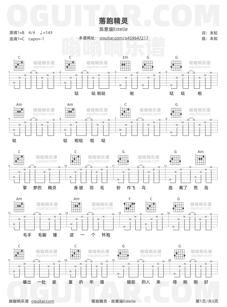 以上就是C调版的落跑精灵弹唱简谱,如果正是您所寻找的六线高清图片谱,希望能收藏本站,这里会源源不断更新各种陈意涵Estelle的曲谱。