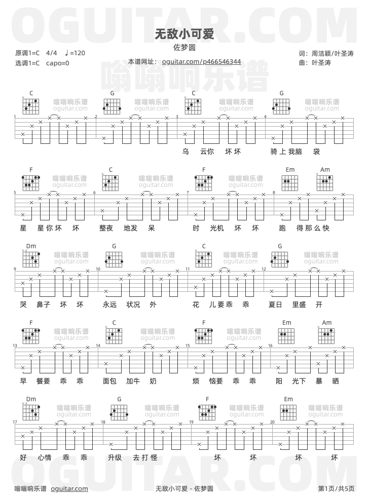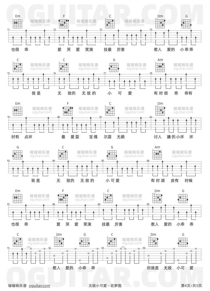 无敌小可爱吉他谱,佐梦圆歌曲,C调指弹简谱,5张教学六线谱