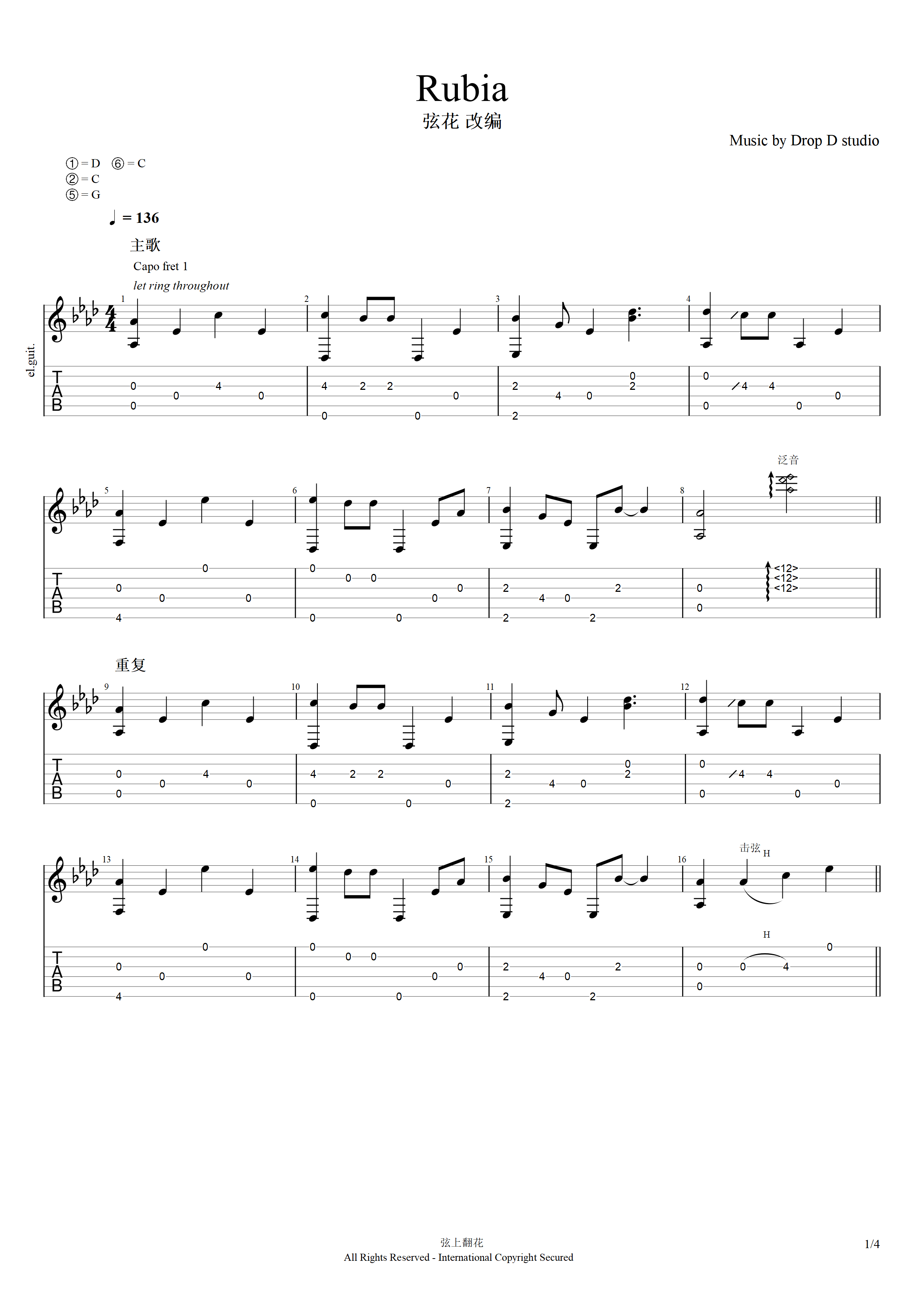 Rubia吉他指弹谱,崩坏3印象曲,由周深演唱,来自B站@弦上翻花编配吉他谱,附指弹演示。这个调弦正常夹1品应该是C调,这里作者把它当G调用了,还挺顺手的。。
