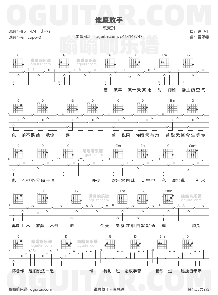 谁愿放手吉他谱简单版,它是陈慧琳演唱的原版歌曲,指弹六线谱子由嗡嗡响制谱,是一首经典歌曲编配的G调吉他简谱,演唱时可夹第3品(Capo=3),演奏弹唱时间为3分1秒,原调为Bb本谱采用G调,是非常好听的新手弹唱谱,下面3张完整版高清曲谱图片由吉他部落jita2012.com为大家更新分享,有喜欢吉它的朋友欢迎收藏!