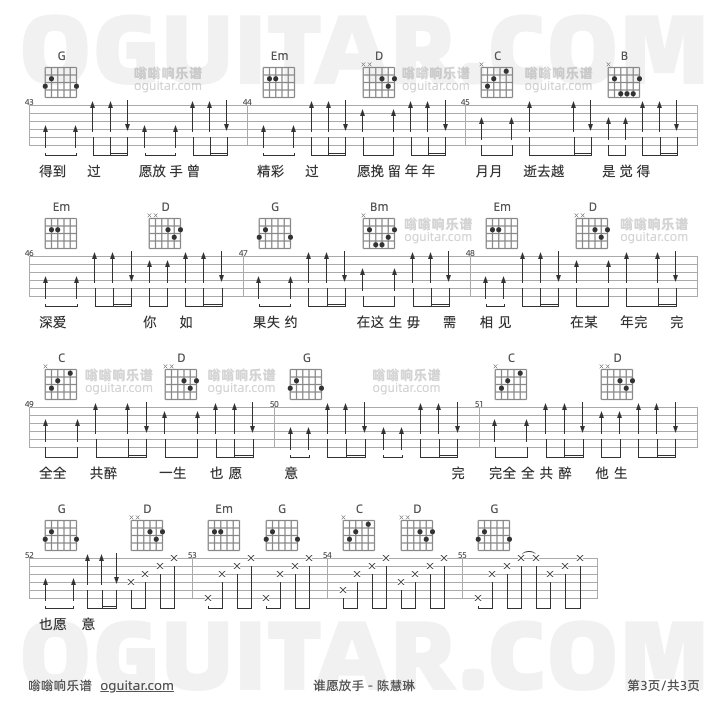 谁愿放手吉他谱,陈慧琳歌曲,G调指弹简谱,3张教学六线谱