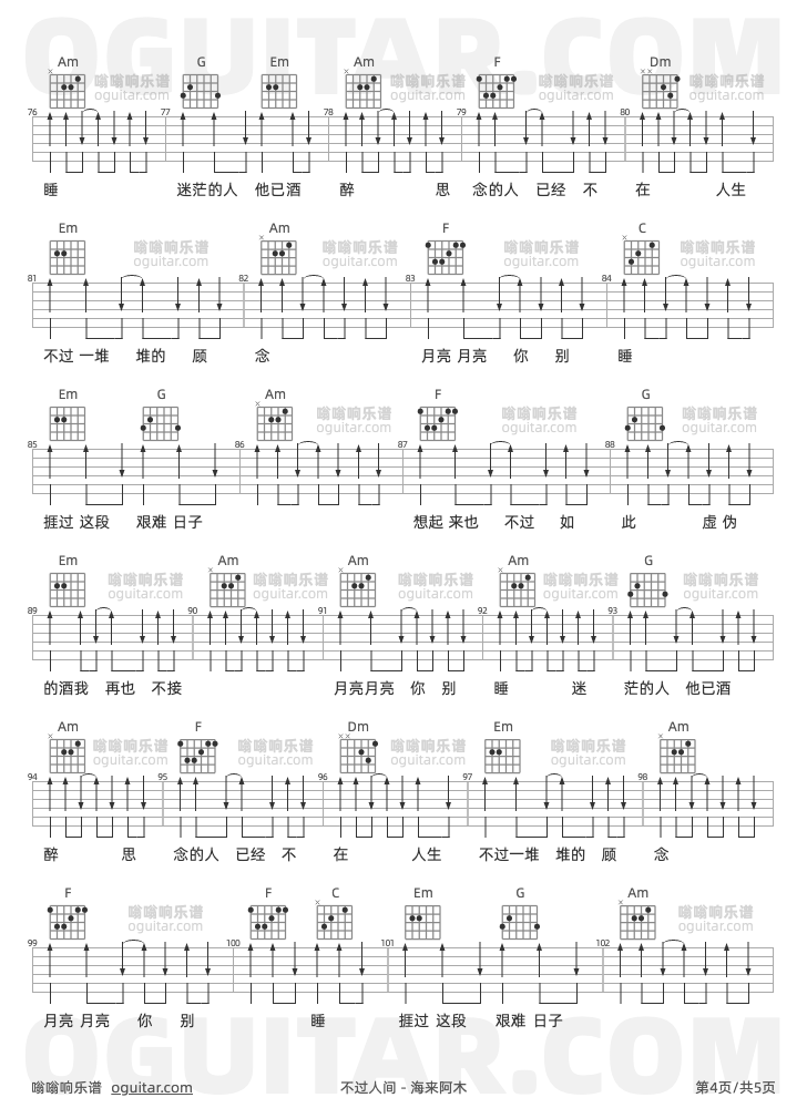 不过人间吉他谱,海来阿木歌曲,C调指弹简谱,5张教学六线谱