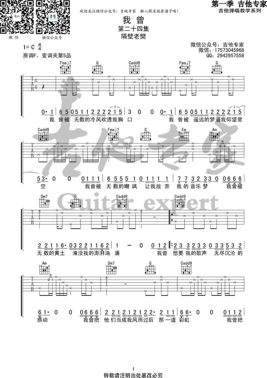 以上就是隔壁老樊的C调版的(我曾)曲谱全部内容,如果正是您所寻找的六线高清图片谱,希望能收藏本站,这里会源源不断更新各种隔壁老樊的曲谱。所以,如果你想学习吉他,无论你的目标是成为一名吉他大师还是简单地弹唱自己喜欢的歌曲,我们强烈推荐你来我们的网站,这里是你学习吉他的最佳选择!