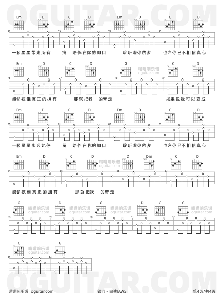 银河吉他谱简单版,它是白鲨JAWS演唱的原版歌曲,指弹六线谱子由嗡嗡响制谱,是一首经典歌曲编配的G调吉他简谱,演唱时可夹第1品(Capo=1),演奏弹唱时间为5分34秒,原调为Ab本谱采用G调,是非常好听的新手弹唱谱,下面4张完整版高清曲谱图片由吉他部落jita2012.com为大家更新分享,有喜欢吉它的朋友欢迎收藏!