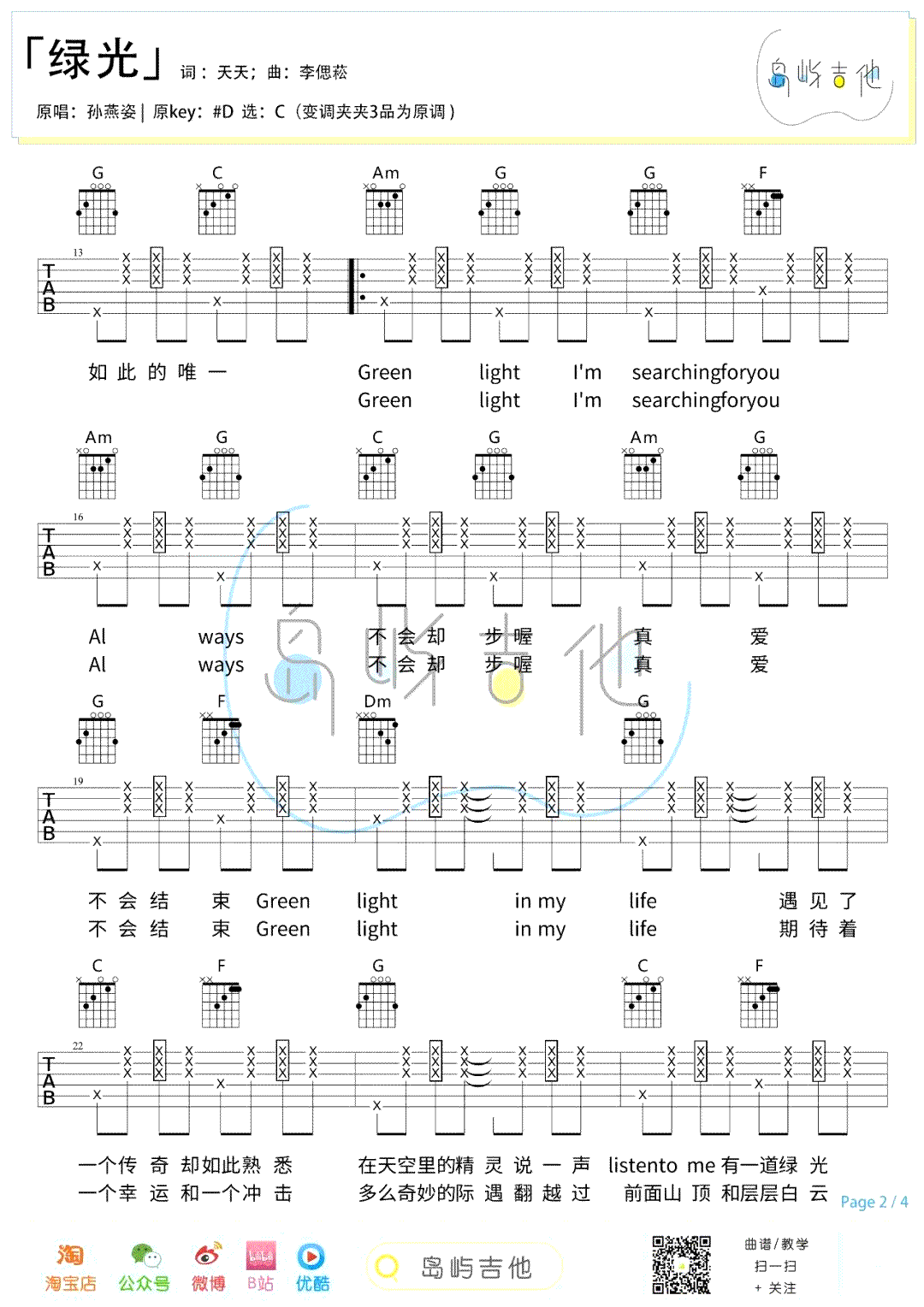 绿光吉他谱,它是天天李偲菘演唱的歌曲,由岛屿吉他制谱,是一首经典歌曲编配的C调吉他谱,,本谱采用C调冷门歌非常好听的弹唱曲谱,下面四张完整版高清曲谱由吉他谱大全为大家更新分享,有喜欢吉它的朋友欢迎关注!