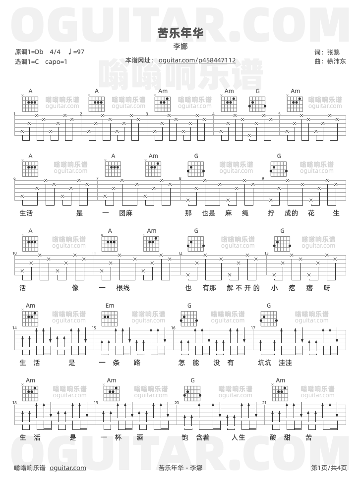 苦乐年华吉他谱,李娜歌曲,C调指弹简谱,4张教学六线谱