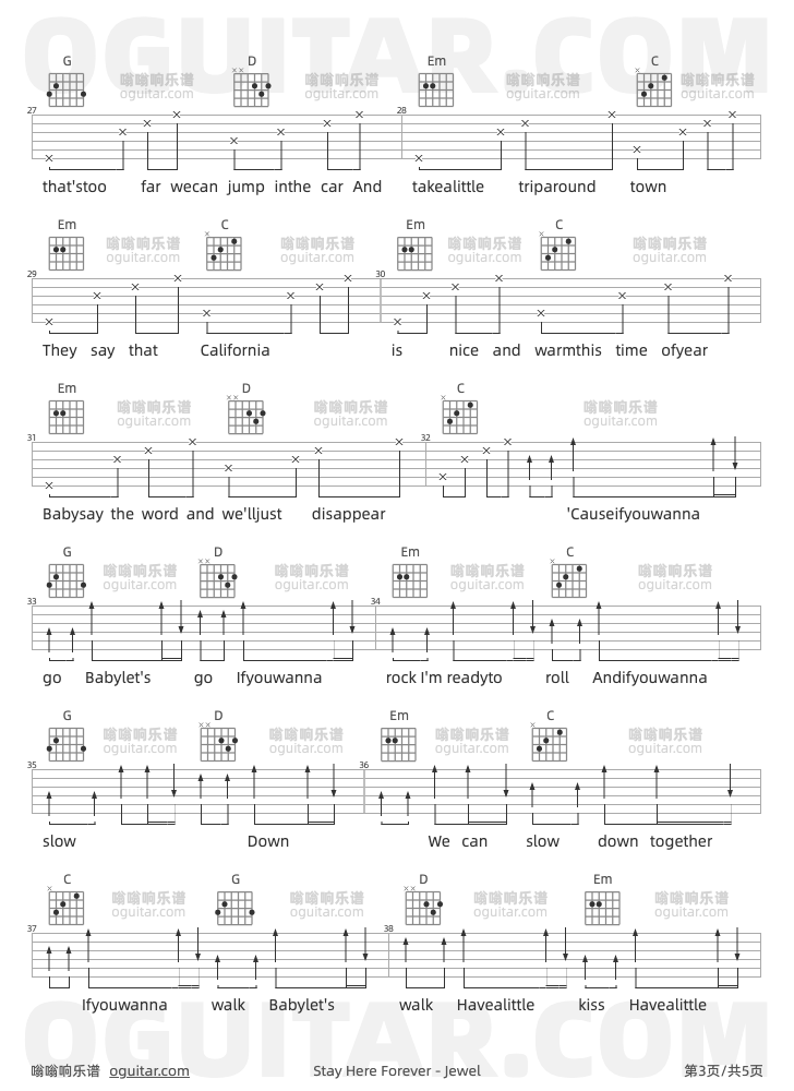 StayHereForever吉他谱简单版,它是Jewel演唱的原版歌曲,指弹六线谱子由嗡嗡响制谱,是一首经典歌曲编配的G调吉他简谱,演唱时可不使用变调夹,演奏弹唱时间为3分3秒,原调为G本谱采用G调,是非常好听的新手弹唱谱,下面5张完整版高清曲谱图片由吉他部落jita2012.com为大家更新分享,有喜欢吉它的朋友欢迎收藏!