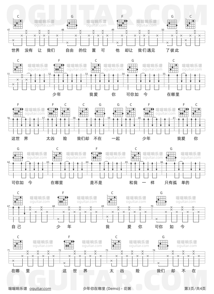 少年你在哪里吉他谱,花粥歌曲,C调指弹简谱,4张教学六线谱【Demo版】