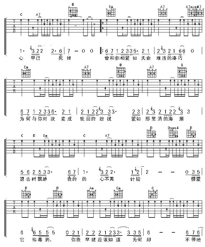 爱情诺曼底吉他谱,原版黄征歌曲,简单G调指弹曲谱,高清六线乐谱