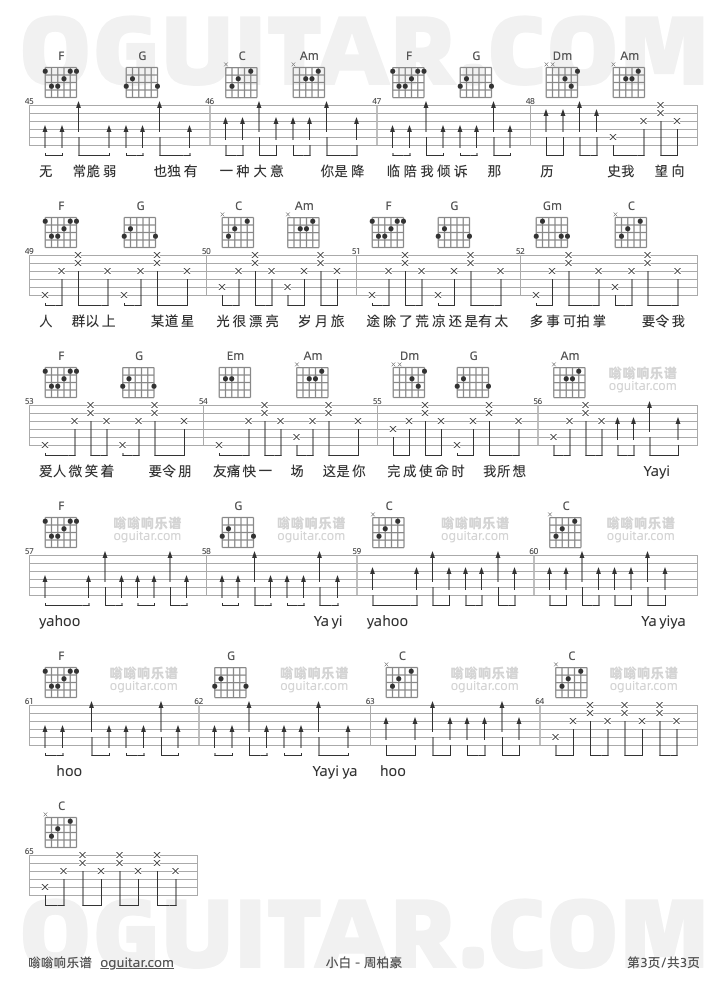 小白吉他谱,周柏豪歌曲,C调指弹简谱,3张教学六线谱