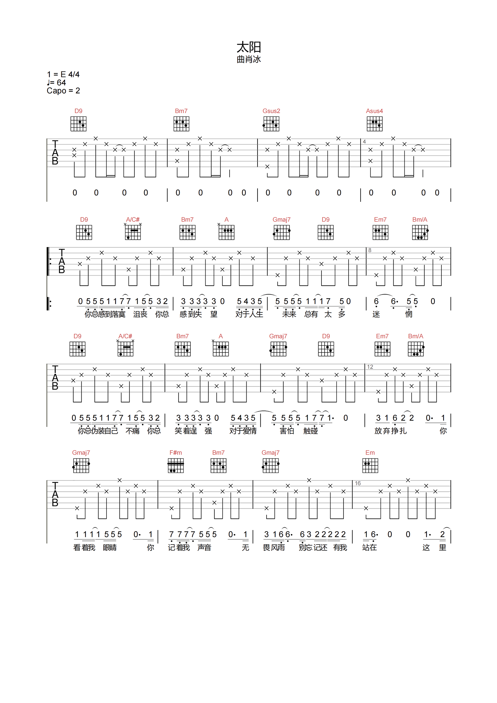 太阳吉他谱,它是曲肖冰演唱的原版歌曲,这首歌的歌词和旋律都非常富有感染力.经典歌曲编配的D调E夹2品 是非常好听弹奏难度:3级较简单的入门弹唱曲谱,下面为大家分享高清图片谱,有喜欢吉它的朋友欢迎关注!