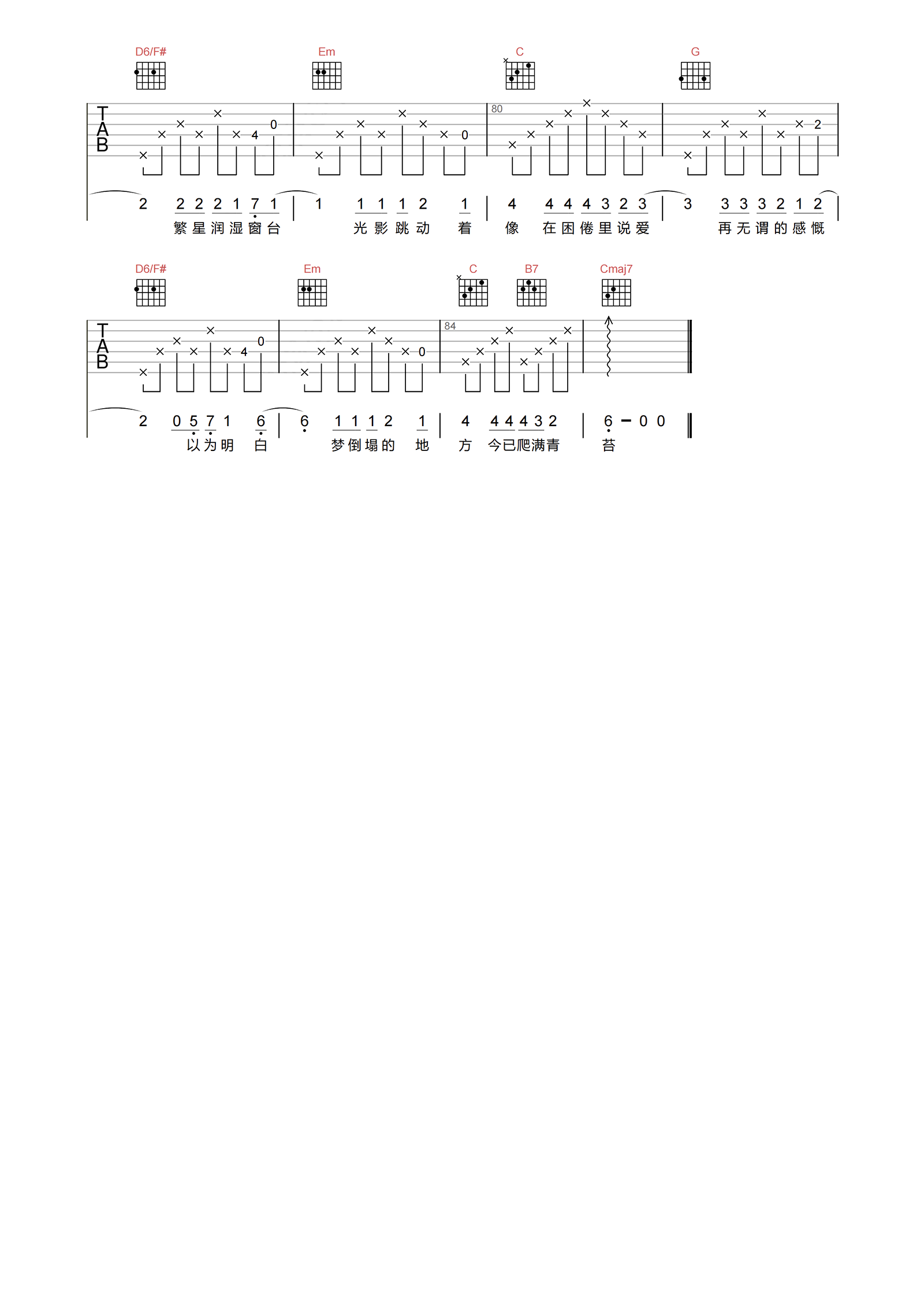 静止吉他谱,取自演唱的歌曲是经典G调指弹编配的曲谱,非常好听的弹唱曲谱,下面4张高清曲谱由吉曲谱网为大家更新分享,有喜欢吉它的朋友欢迎关注!